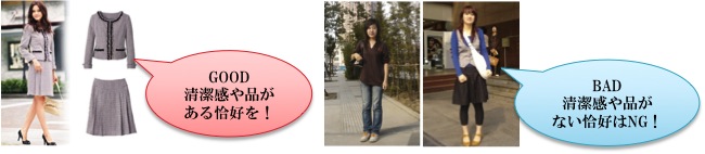 必ず、靴下またはストッキング、タイツを履きましょう。GOOD 清潔感・品のある恰好。スーツの必要はないが、オフィス用の服装 BAD TシャツにGパンなどのカジュアルな恰好、清潔感・品のない恰好