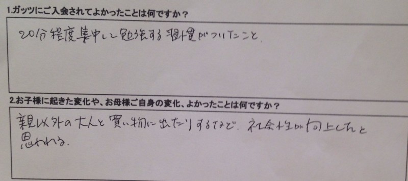保護者様のお声(Sさん) 保護者様のお声(Sさん) https://esoulc.com/wp-content/uploads/2019/11/voice-s2.jpg 800 355 家庭教師ガッツ 家庭教師ガッツ //esoulc.com/wp-content/uploads/2020/03/gsc-logo.png 2019年11月15日 2020年1月17日 アンケート内容Q. ガッツにご入会されてよかったことは何ですか? A. 20分程度集中して勉強する習慣がついたこと。 Q. お子様に起きた変化や、お母様ご自身の変化、よかったことは何ですか? A. 親以外の大人と買い物に出たりするなど、社会性が向上したと思われる。 手書きアンケート画像